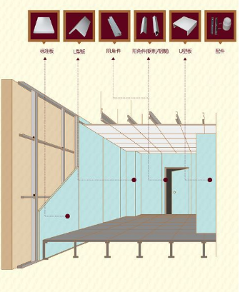 1.白色烤漆钢板,背衬石膏板结构。(包含扣条,压条,螺钉)。