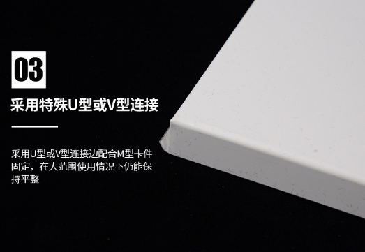 7、墙板连接:采用特殊U形或V形连接边配合M形卡件固定;在大范围使用情况下仍能保持墙面良好的平整度。