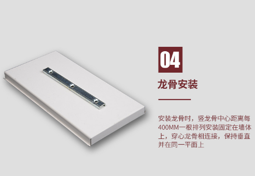 1、安装龙骨时,竖龙骨中心距离每400mm一根排列安装固定在墙体上,穿心龙骨相连接,保持垂直并在同一平面上。